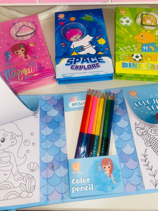 ویژگی: هر پک شامل دو کتابچه رنگ آمیزی (۶۰ برگ)+۸مدادرنگی دوسر(۱۶عدد)