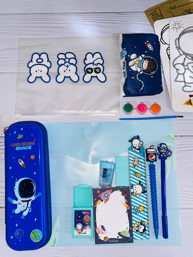 آیتم های پک:: جامدادی+کیسه ضدآب +جادستمالی+پک دوتایی رنگ آمیزی با گواش+نوت پد+پاکن شعبده بازی+تراش+هایلایتر+جادستمالی پارچه ای+خطکش+اتود+رواننویس