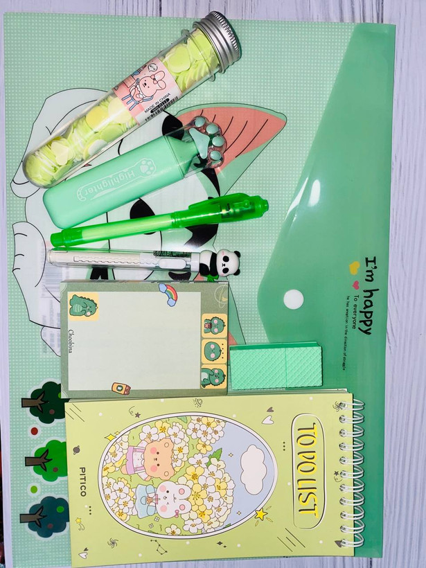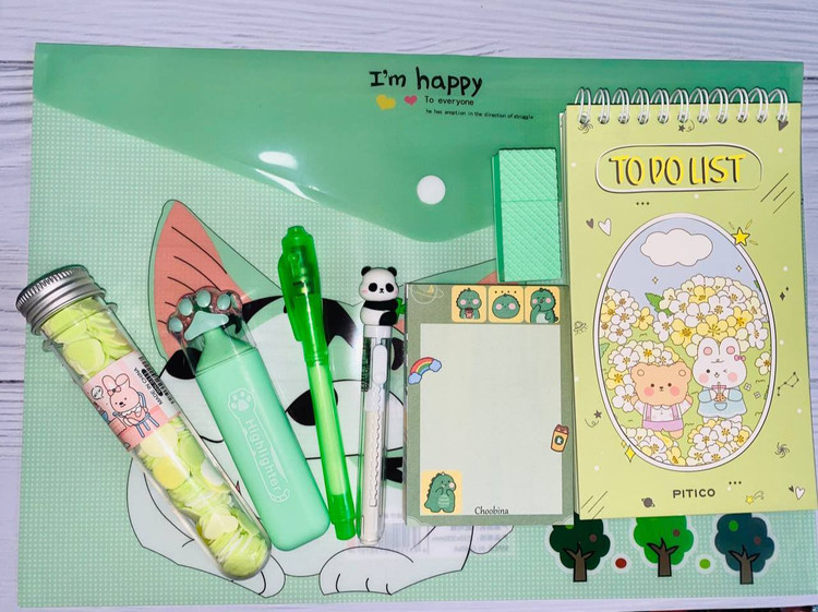 آیتم های پک:پوشه +دفترچه کیوت+هایلایتر+پاکن کاتری +خودکار نامرئی+صابون فانتزی +نوت پد