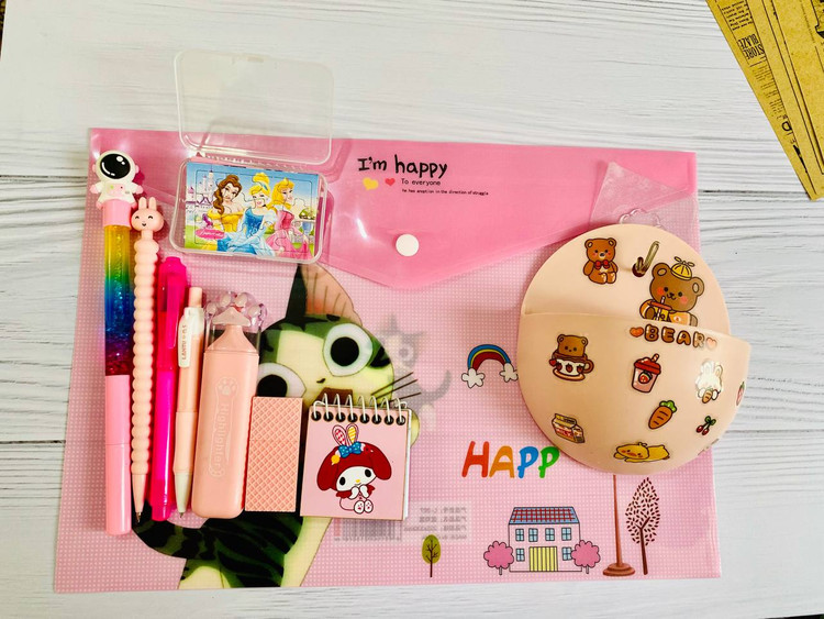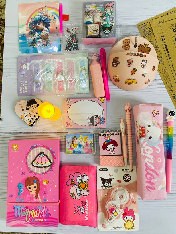 آیتم های پک:نقاشی الماسی +مهر غلتکی +جالوازمی +هایلایتر+چسب زخم+کتاب سه قسمتی رنگ آمیزی با مداد رنگی شانزده رنگ+نوت پد+دفترچه قلبی+چراغ خواب+پازل پنج تایی+غلطگیر+جادستمالی+اتود+جامدادی+خودکارآکواریومی+دفترچه جلد چوبی+خودکار نامرئی